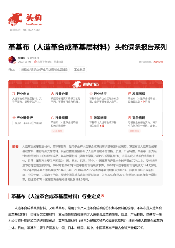 【头豹研究院】【20230905】革基布(人造革合成革基层材料) 头豹词条报告系列-15页