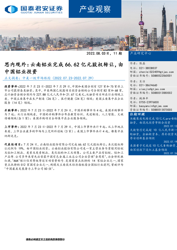 【国泰君安证券】【20220803】产业观察11期:思内观外,云南铝业完成66.62亿元股权转让,由中国铝业投资-21页