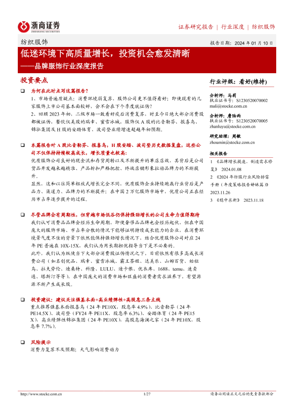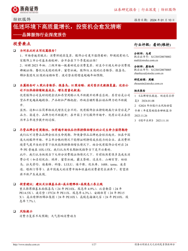 【浙商证券】【20240110】低迷环境下高质量增长,投资机会愈发清晰——品牌服饰行业深度报告-27页