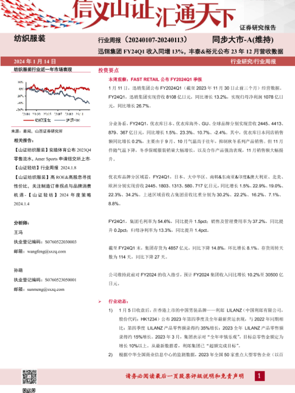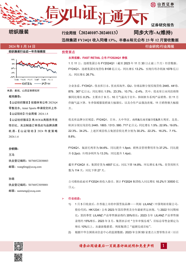 【山西证券】【20240114】纺织服装行业周报:迅销集团FY24Q1收入同增13%,丰泰&裕元公布23年12月营收数据-21页