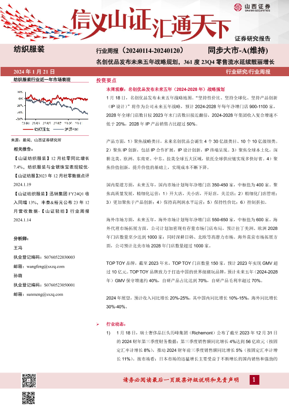 【山西证券】【20240121】纺织服装行业周报:名创优品发布未来五年战略规划,361度23Q4零售流水延续靓丽增长-26页