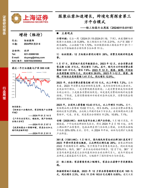 【上海证券】【20240121】20240121-上海证券-轻工纺服行业周报:服装社零加速增长,跨境电商探索第三方平台模式-11页