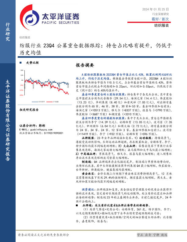 【太平洋证券】【20240125】纺服行业23Q4公募重仓数据跟踪:持仓占比略有提升,仍低于历史均值-10页