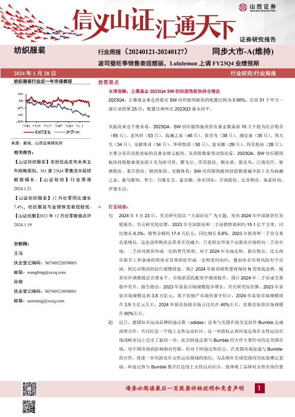 【山西证券】【20240128】纺织服装行业周报:波司登旺季销售表现靓丽,Lululemon上调FY23Q4业绩预期-24页