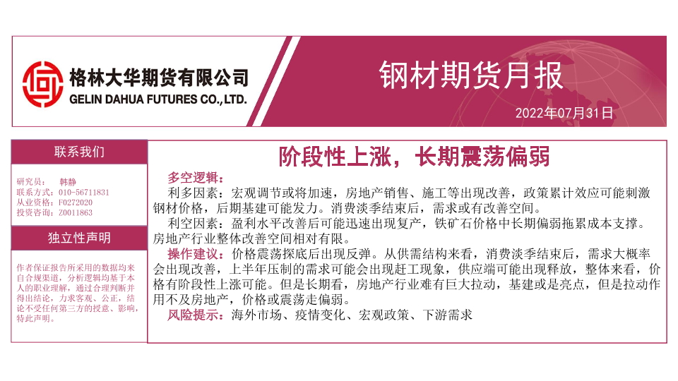 【格林大华期货】【20220731】钢材期货月报:阶段性上涨,长期震荡偏弱-28页