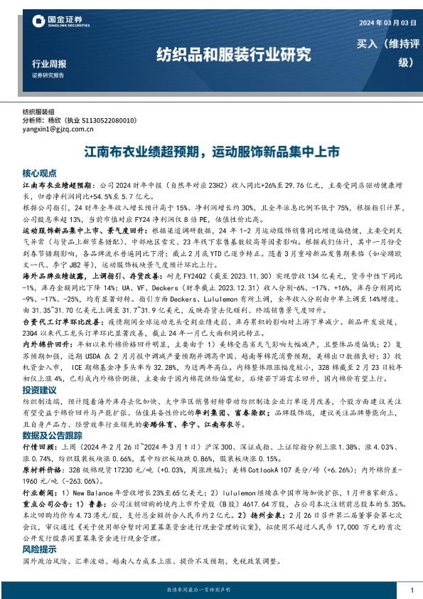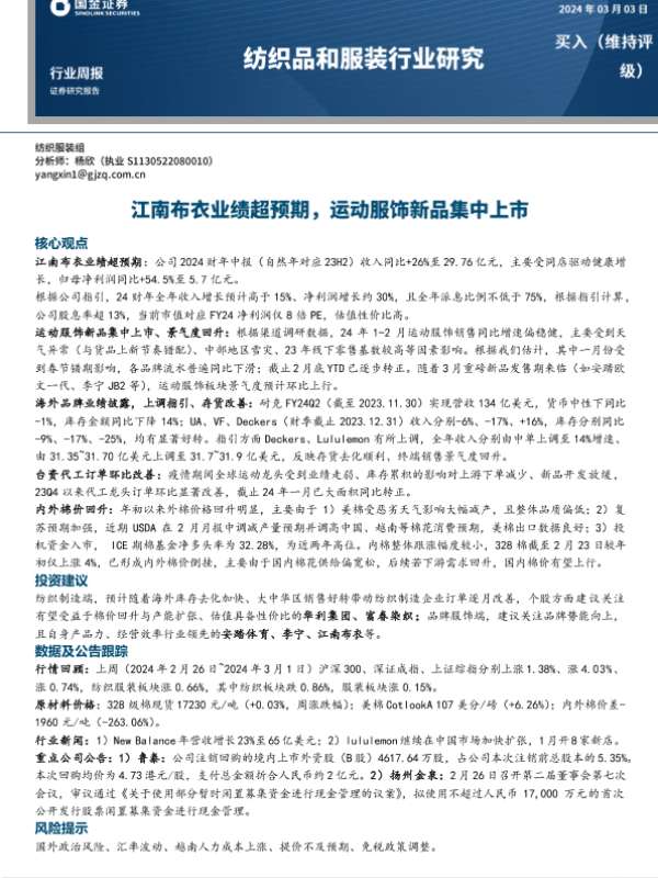 【国金证券】【20240303】20240303-国金证券-纺织品和服装行业研究:江南布衣业绩超预期,运动服饰新品集中上市-12页