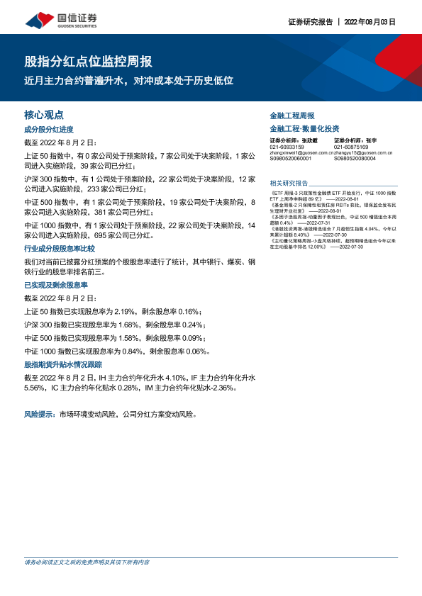 【国信证券】【20220803】股指分红点位监控周报:近月主力合约普遍升水,对冲成本处于历史低位-16页