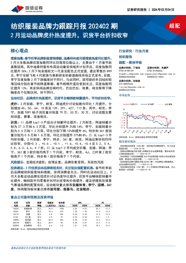 【国信证券】【20240304】20240304-国信证券-纺织服装品牌力跟踪月报202402期:2月运动品牌虎扑热度提升,识货平台折扣收窄-18页