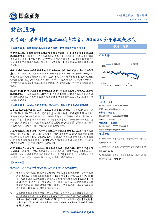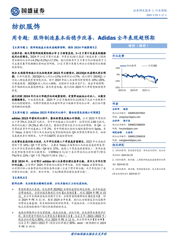 【国盛证券】【20240317】纺织服饰行业周专题:服饰制造基本面稳步改善,Adidas全年表现超预期-18页