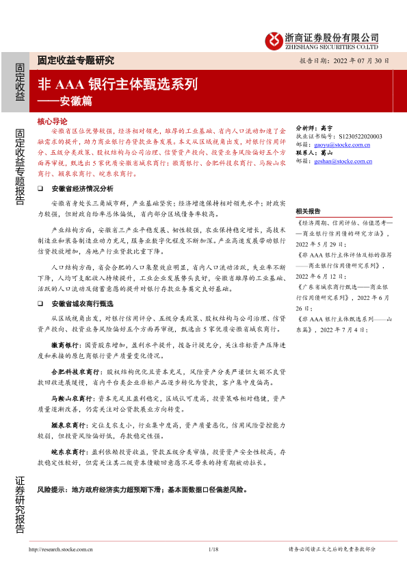 【浙商证券】【20220730】固定收益专题研究:非AAA银行主体甄选系列_安徽篇-18页