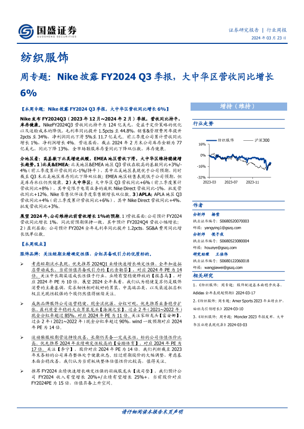 【国盛证券】【20240323】20240323-国盛证券-纺织服饰行业周报:周专题,Nike披露FY2024 Q3季报,大中华区营收同比增长6%-15页