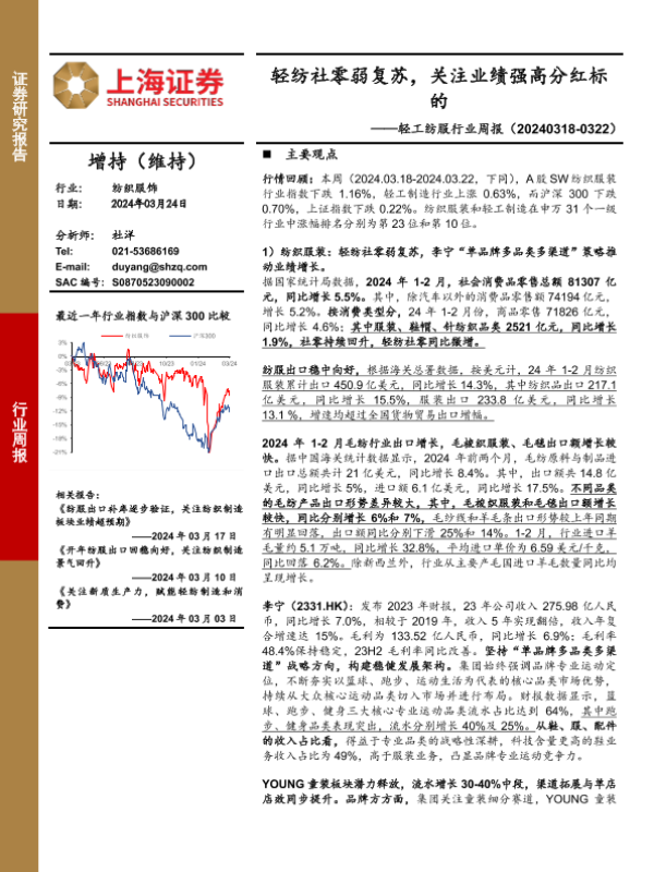 【上海证券】【20240324】轻工纺服行业周报:轻纺社零弱复苏,关注业绩强高分红标的-12页