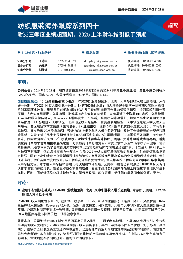 【国信证券】【20240323】纺织服装海外跟踪系列四十:耐克三季度业绩超预期,2025上半财年指引低于预期-10页
