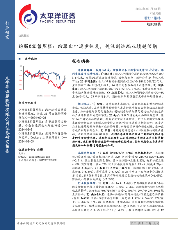 【太平洋证券】【20240318】纺服&零售周报:纺服出口逐步恢复,关注制造端业绩超预期-18页