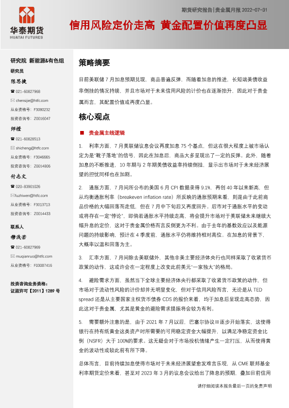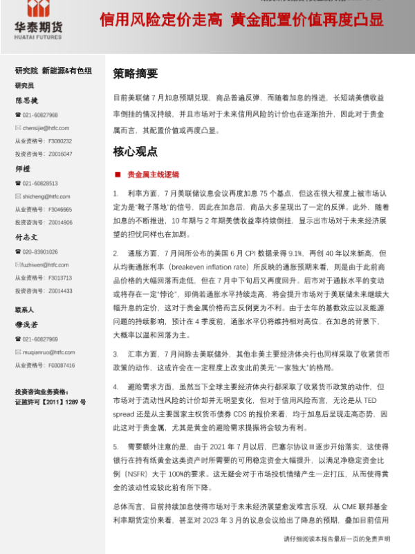 【华泰期货】【20220731】贵金属月报:信用风险定价走高,黄金配置价值再度凸显-18页