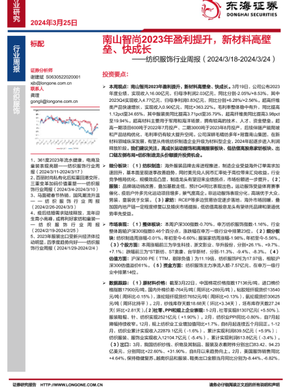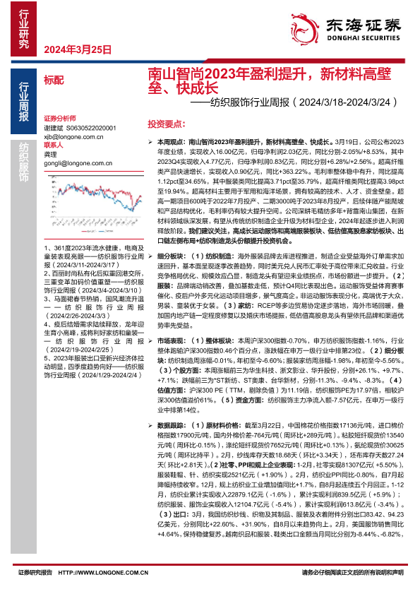 【东海证券】【20240325】20240325-东海证券-纺织服饰行业周报:南山智尚2023年盈利提升,新材料高壁垒、快成长-12页