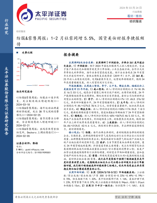 【太平洋证券】【20240324】纺服&零售周报:1-2月社零同增5.5%,国货美妆财报季捷报频传-17页