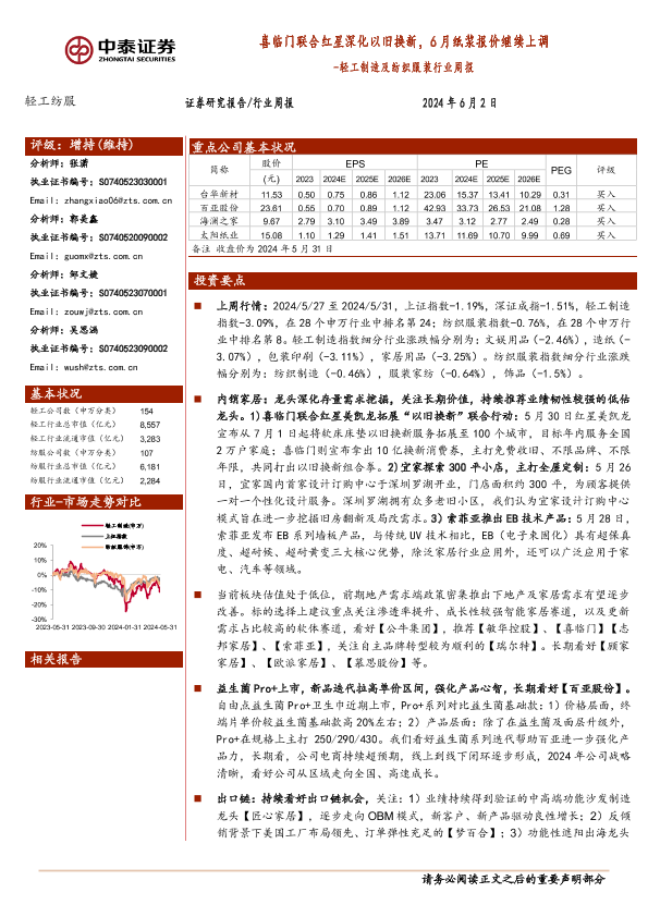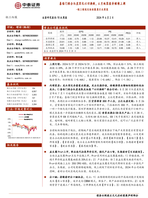 【中泰证券】【20240602】轻工制造及纺织服装行业周报:喜临门联合红星深化以旧换新,6月纸浆报价继续上调-23页