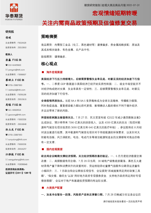 【华泰期货】【20220731】宏观大类及商品月报:宏观情绪短期转暖,关注内需商品政策预期及估值修复交易-45页