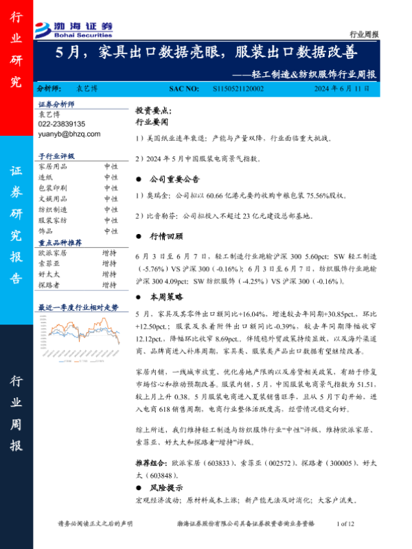 【渤海证券】【20240611】20240611-渤海证券-轻工制造&纺织服饰行业周报:5月,家具出口数据亮眼,服装出口数据改善-12页