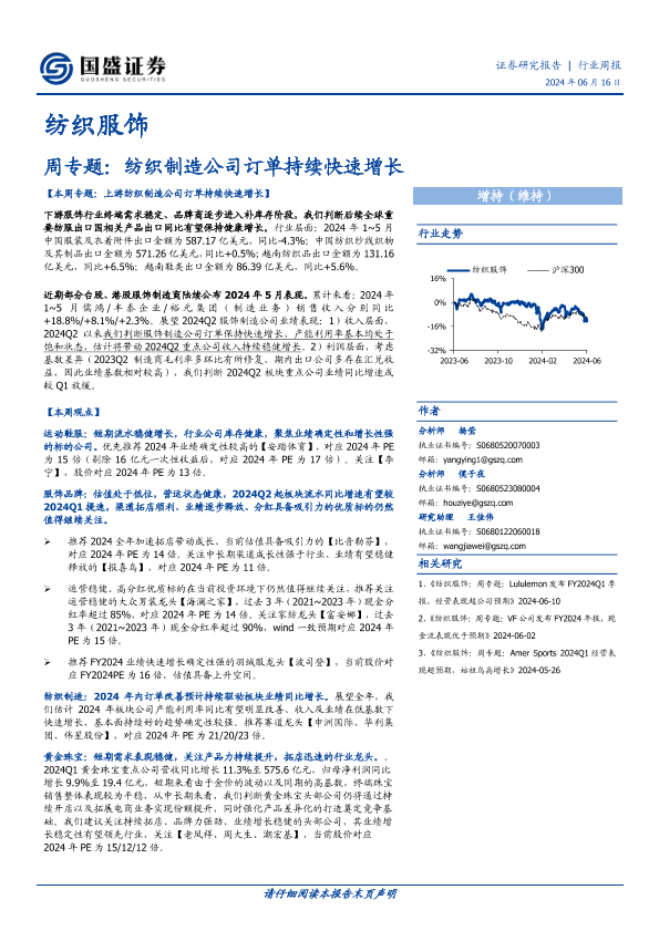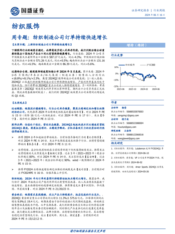 【国盛证券】【20240616】20240616-国盛证券-纺织服饰行业周专题:纺织制造公司订单持续快速增长-15页
