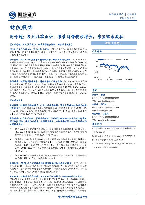 【国盛证券】【20240623】纺织服饰行业周专题:5月社零出炉,服装消费稳步增长,珠宝需求疲软-14页