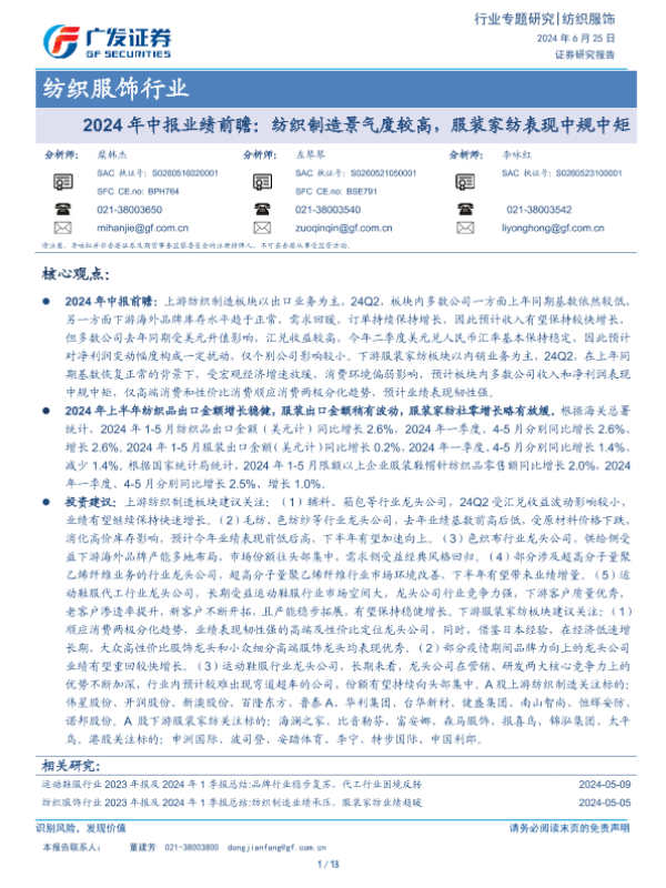 【广发证券】【20240625】2024年中报业绩前瞻:纺织制造景气度较高,服装家纺表现中规中矩-13页
