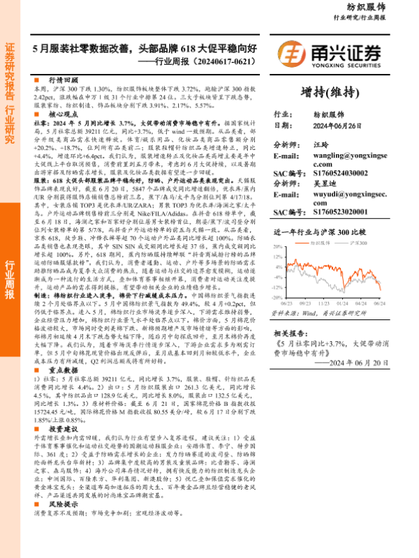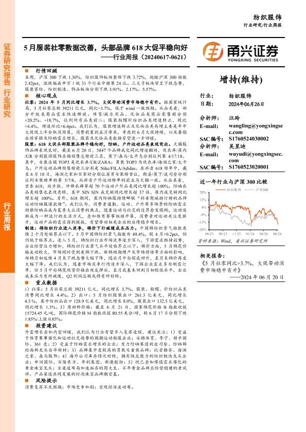 【甬兴证券】【20240626】20240626-甬兴证券-纺织服饰行业周报:5月服装社零数据改善,头部品牌618大促平稳向好-13页