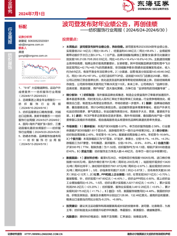 【东海证券】【20240701】20240701-东海证券-纺织服饰行业周报:波司登发布财年业绩公告,再创佳绩-11页