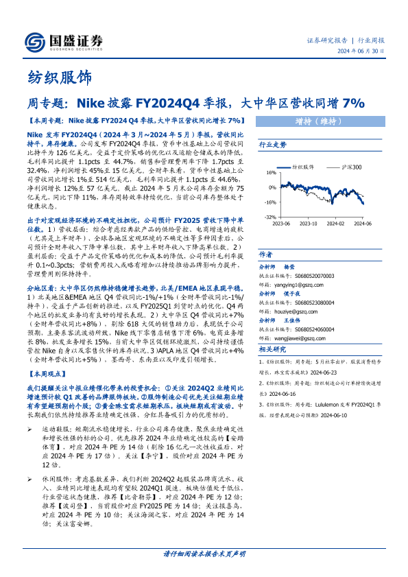 【国盛证券】【20240630】20240630-国盛证券-纺织服饰行业周专题:Nike披露FY2024Q4季报,大中华区营收同增7%-14页