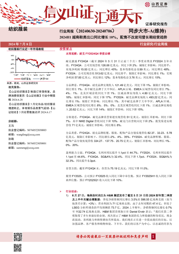 【山西证券】【20240708】纺织服装行业周报:2024H1越南鞋类出口同比增长10%,配售不改波司登长期经营趋势-22页
