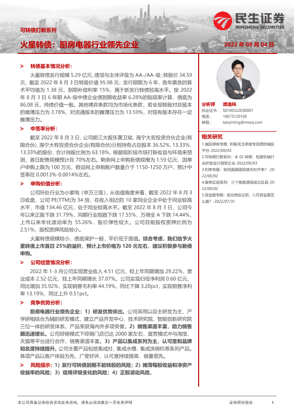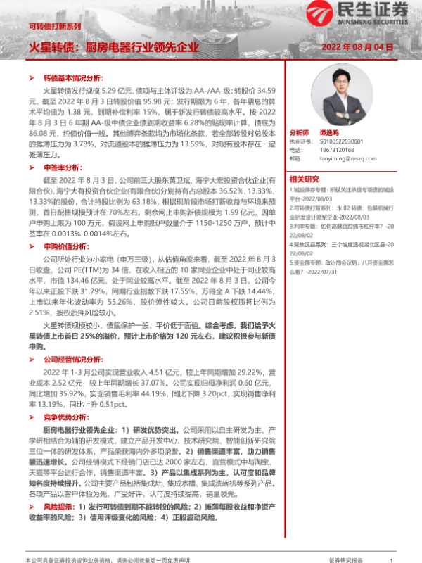 【民生证券】【20220804】可转债打新系列:火星转债,厨房电器行业领先企业-15页