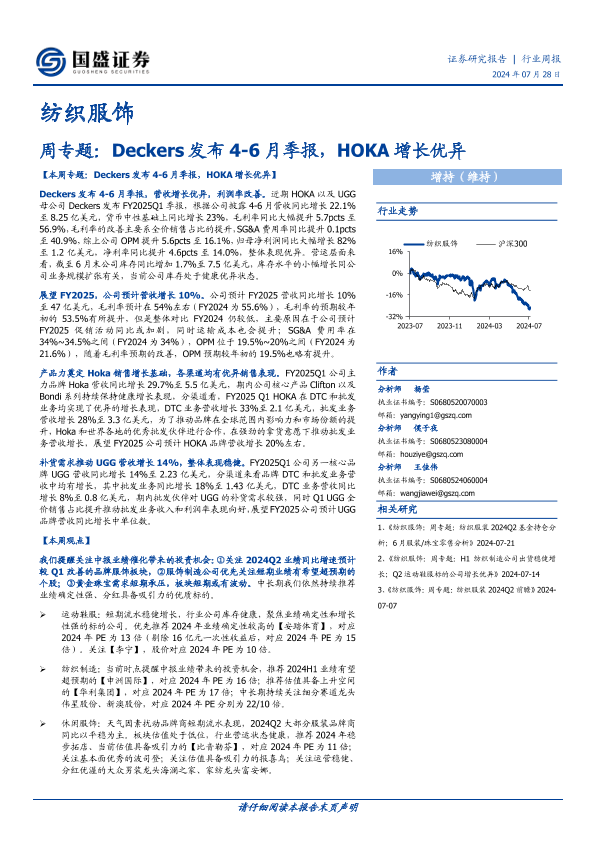 【国盛证券】【20240728】纺织服饰行业周专题:Deckers发布4-6月季报,HOKA增长优异-17页