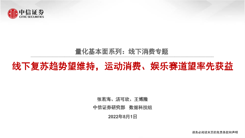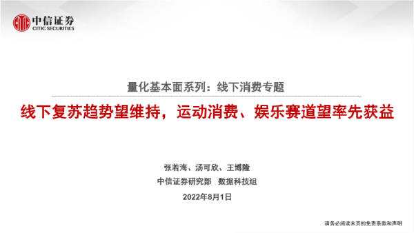 【中信证券】【20220801】量化基本面系列:线下消费专题,线下复苏趋势望维持,运动消费、娱乐赛道望率先获益-21页