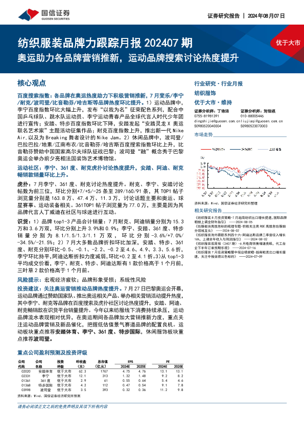 【国信证券】【20240807】20240807-国信证券-纺织服装品牌力跟踪月报202407期:奥运助力各品牌营销推新,运动品牌搜索讨论热度提升-18页