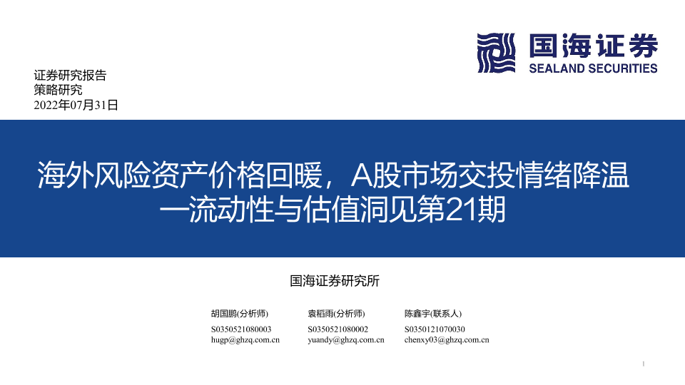 【国海证券】【20220731】流动性与估值洞见第21期:海外风险资产价格回暖,A股市场交投情绪降温-53页
