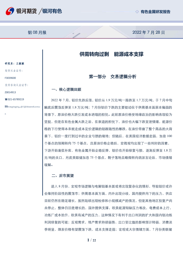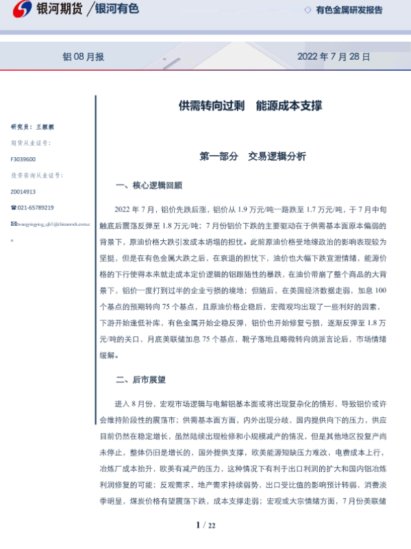 【银河期货】【20220728】铝08月报:供需转向过剩,能源成本支撑-22页