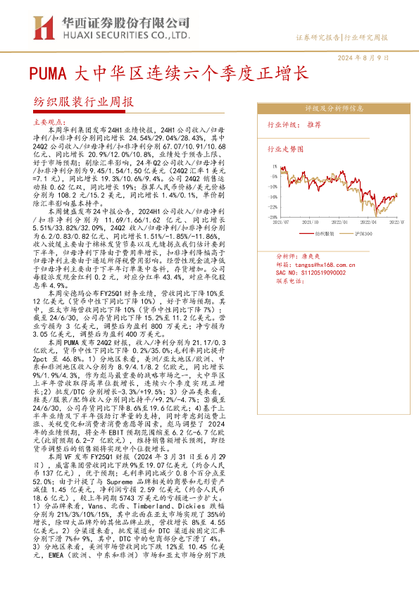 【华西证券】【20240809】20240809-华西证券-纺织服装行业周报:PUMA大中华区连续六个季度正增长-30页