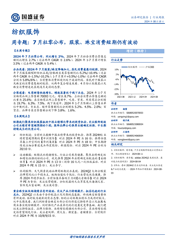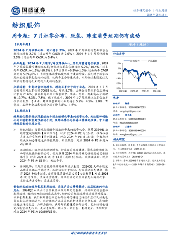 【国盛证券】【20240818】20240818-国盛证券-纺织服饰行业周专题:7月社零公布,服装、珠宝消费短期仍有波动-17页