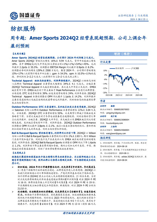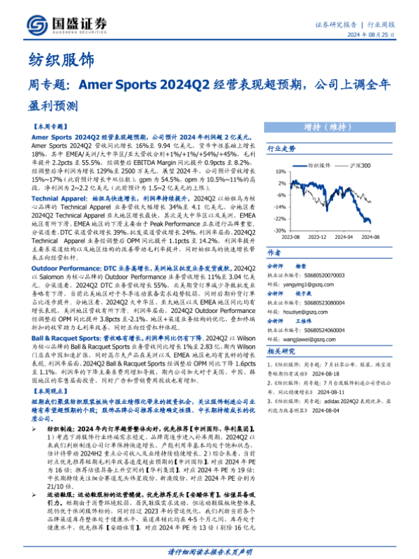 【国盛证券】【20240825】纺织服饰周专题:Amer Sports 2024Q2经营表现超预期,公司上调全年盈利预测-19页
