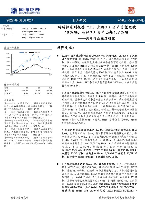【国海证券】【20220802】汽车行业深度研究:特斯拉系列报告十三,上海工厂月产有望突破10万辆,柏林工厂月产已超1.7万辆-31页