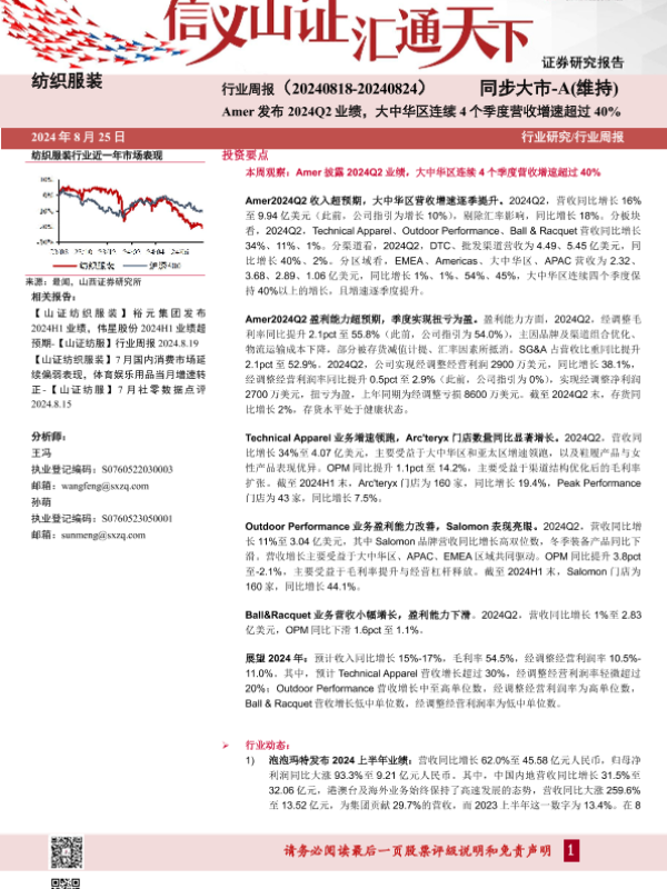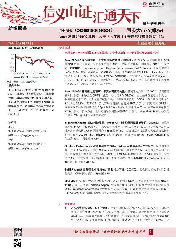 【山西证券】【20240825】纺织服装行业周报:Amer发布2024Q2业绩,大中华区连续4个季度营收增速超过40%-20页