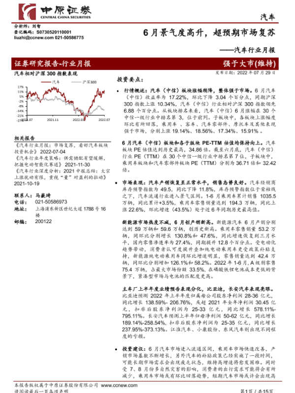 【中原证券】【20220729】汽车行业月报:6月景气度高升,超预期市场复苏-15页