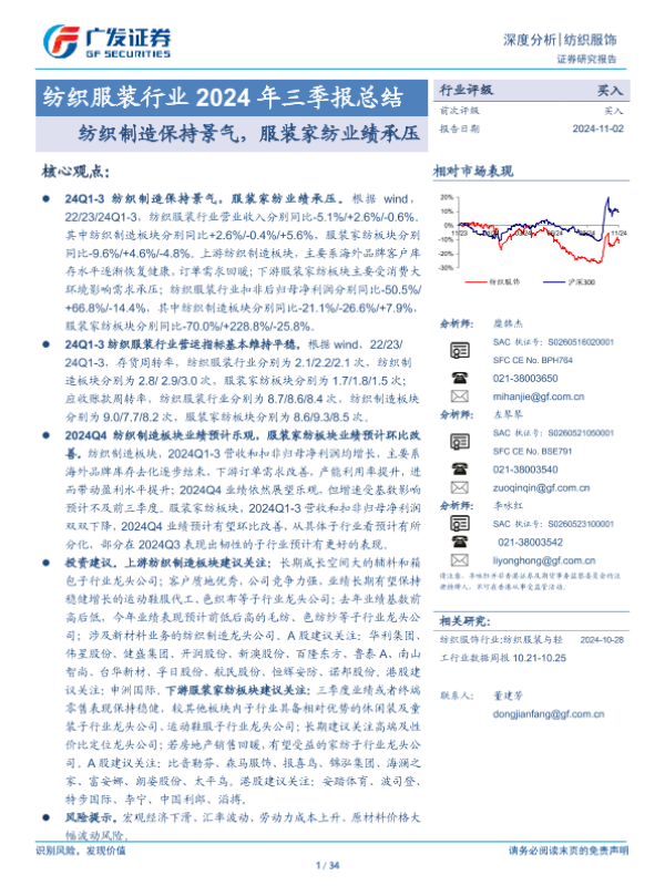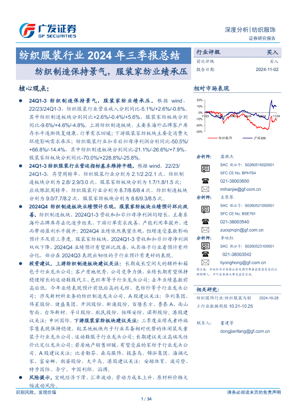 【广发证券】【20241102】纺织服装行业2024年三季报总结:纺织制造保持景气,服装家纺业绩承压-34页