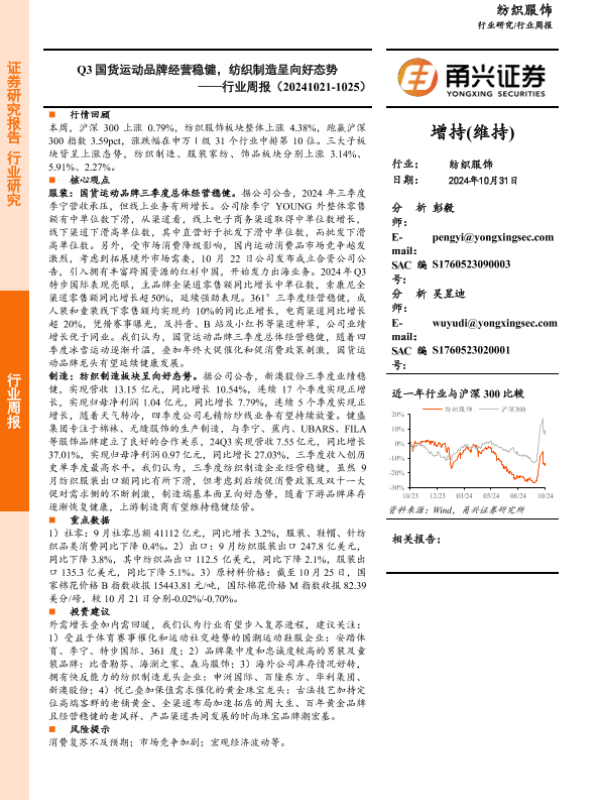 【甬兴证券】【20241031】20241031-甬兴证券-纺织服饰行业周报:Q3国货运动品牌经营稳健,纺织制造呈向好态势-12页