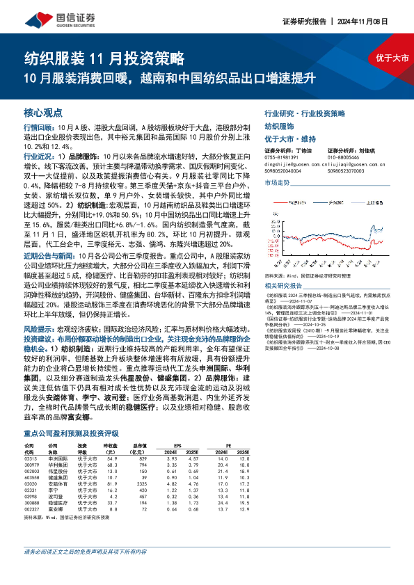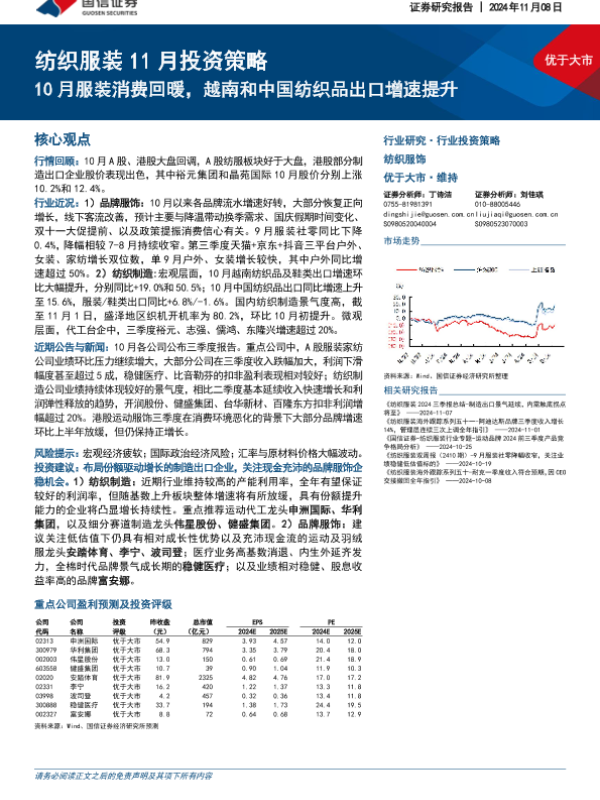 【国信证券】【20241108】20241108-国信证券-纺织服装11月投资策略:10月服装消费回暖,越南和中国纺织品出口增速提升-27页