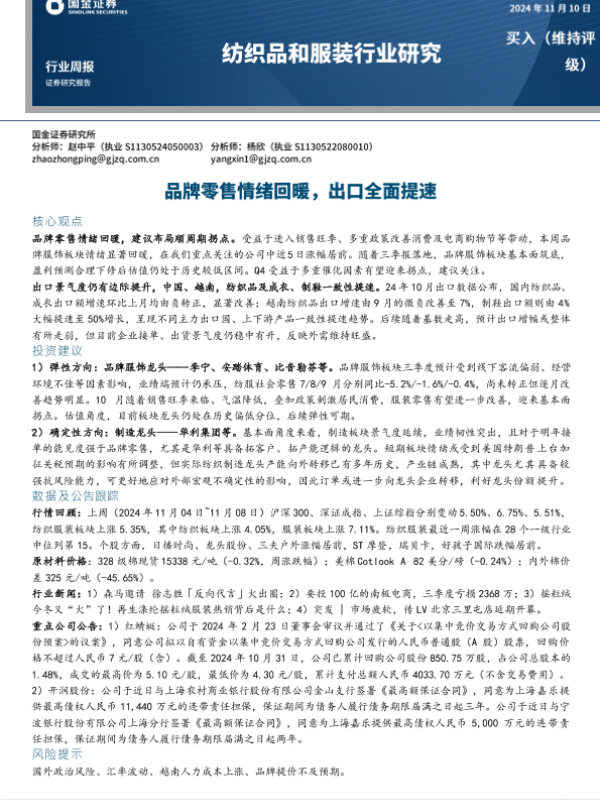 【国金证券】【20241110】20241110-国金证券-纺织品和服装行业周报:品牌零售情绪回暖,出口全面提速-11页