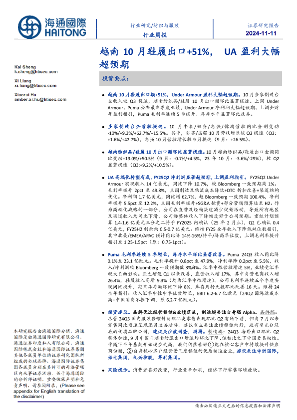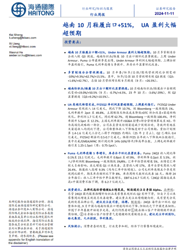 【海通国际】【20241111】纺织与服装行业周报:越南10月鞋履出口+51%,UA盈利大幅超预期-16页