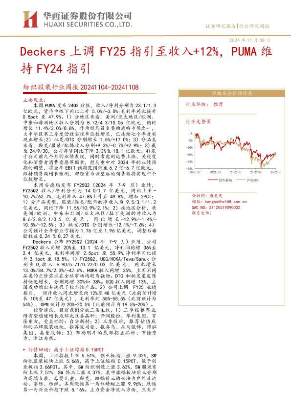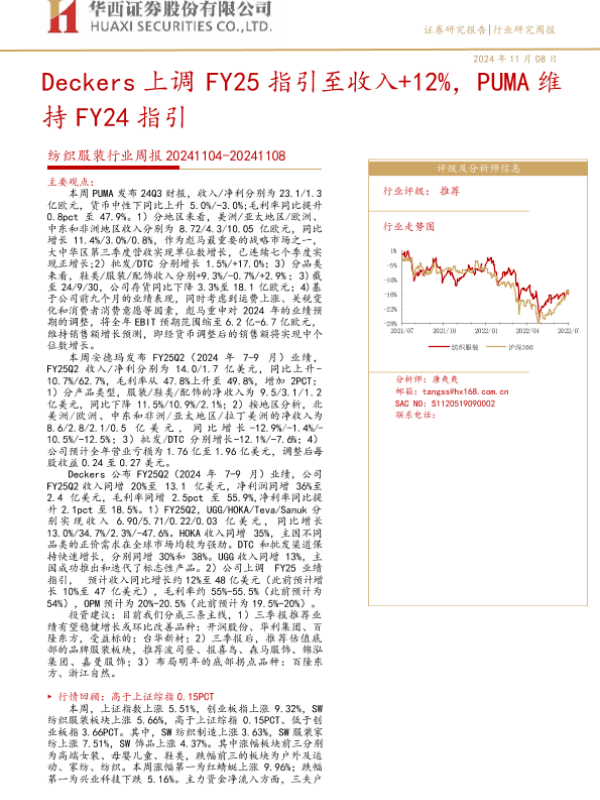 【华西证券】【20241108】20241108-华西证券-纺织服装行业周报:Deckers上调FY25指引至收入+12%,PUMA维持FY24指引-38页