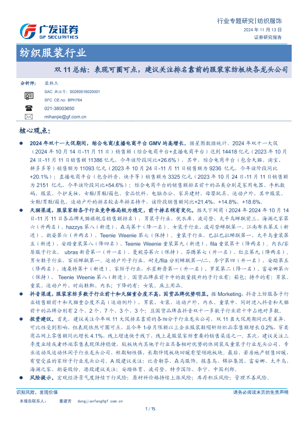 【广发证券】【20241113】20241113-广发证券-纺织服装行业双11总结:表现可圈可点,建议关注排名靠前的服装家纺板块各龙头公司-15页